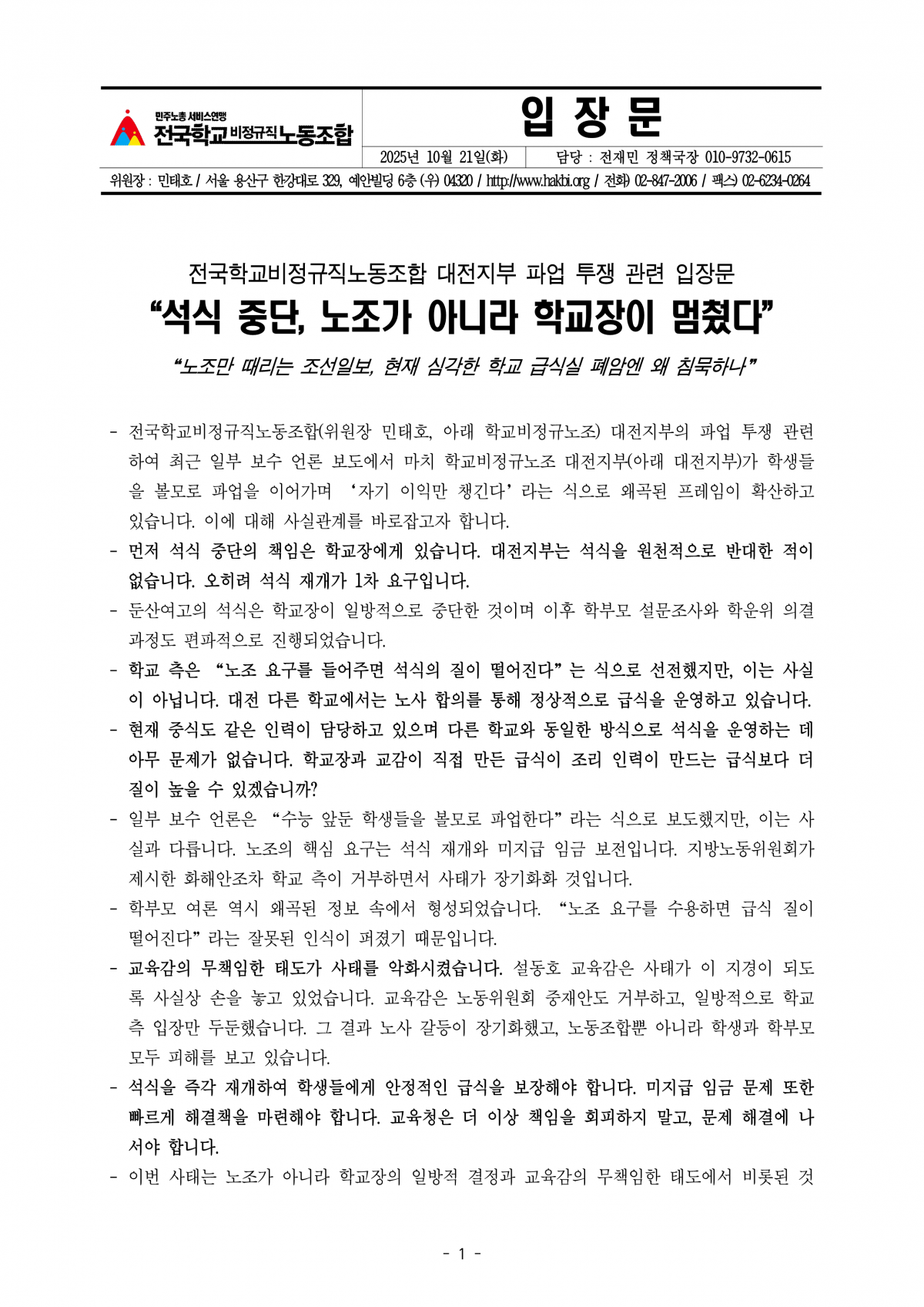 [입장문] “석식 중단, 노조가 아니라 학교장이 멈췄다”(대전지부 파업 투쟁 관련 입장문)