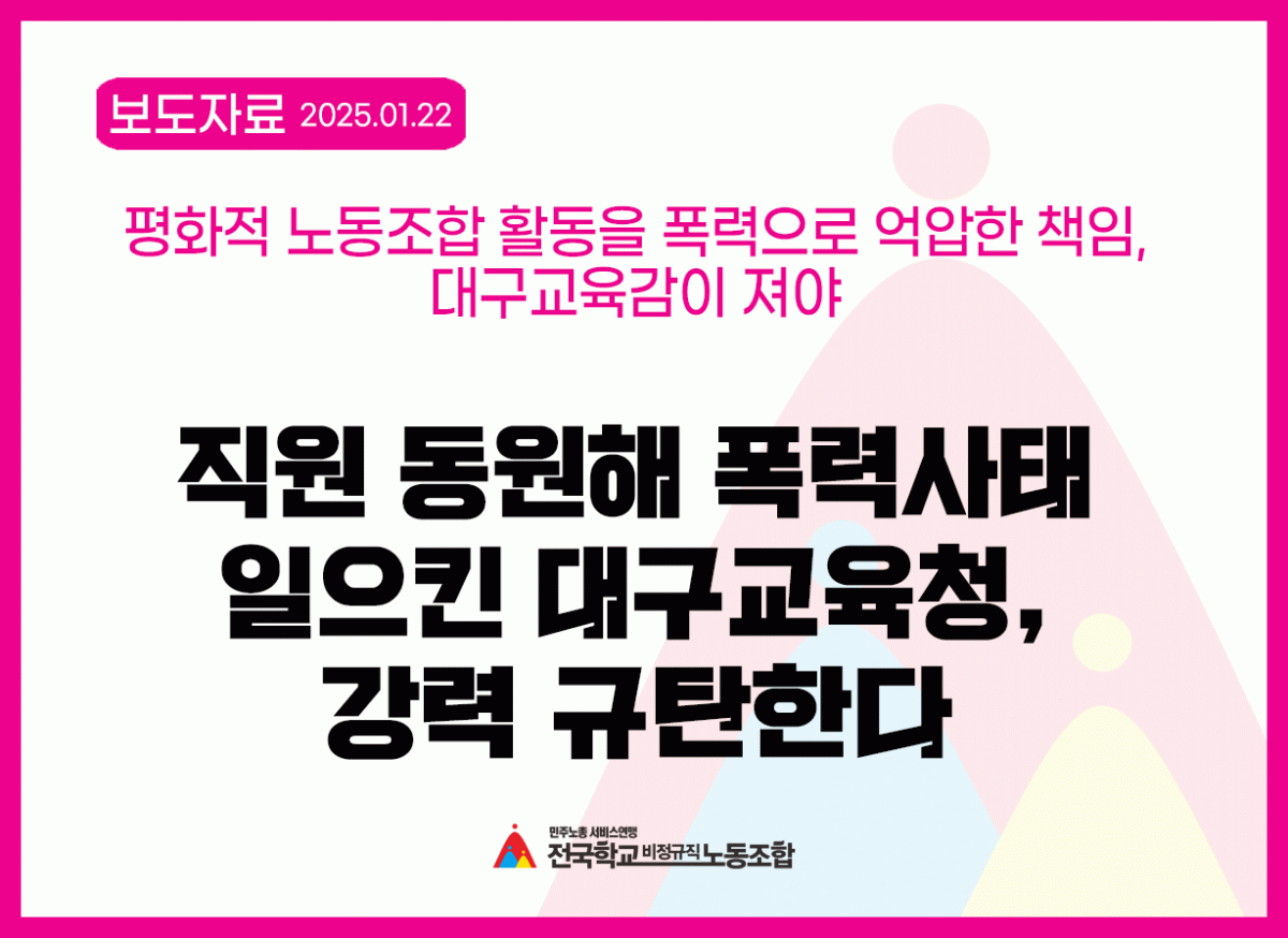 - 전국학교비정규직노동조합은 이번 폭력 사태와 노동조합 활동 방해 행위에 대해 경찰에 정식으로 사건을 접수하였으며, 대구교육청에 공식 사과와 관련자에 대한 엄정한 징계를 요구합니다.