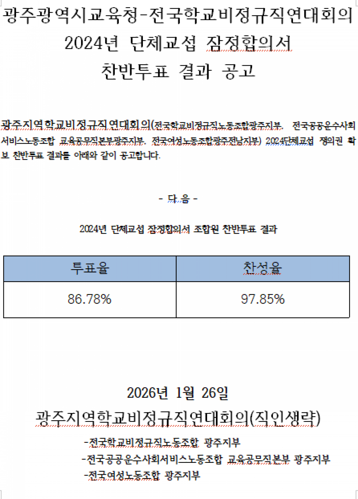 광주광역시교육청-전국학교비정규직연대회의 2024년 단체교섭 잠정합의서 찬반투표 결과 공고