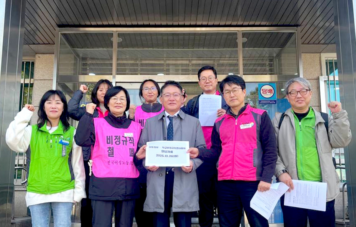 전국학교비정규직노동조합 민태호 위원장은 “학교급식실문제 해결을 위해 교섭하고 있는 것이 결렬되고 조정에 실패했다면 이제 대통령실이 나서서 책임져야 하는 것 아닌가”라며, “국회와 교육부가 나서서 문제를 책임질 수 있도록 대통령실이 진두지휘”할 것을 촉구했다. 연대회의는 11월 20일-21일 1차 총파업, 12월 4일-5일 2차 총파업을 예고하며 연내 합의를 이루지 못할 경우 3차 총력투쟁도 단행할 것을 경고했다. 다만 정부의 적극적 역할과 교육부와 교육청이 진전 가능한 교섭안을 제시할 경우 대화의 길은 열려있음을 강조했다. 기자회견에 이어 5월 1일 이재명 대통령이 맺은 ‘학교비정규직 처우개선’, ‘학교급식 종합대책 마련’ 정책협약 이행을 촉구하는 대통령실 면담이 진행되었다. ■ 2025년 총파업 투쟁 주요 요구안