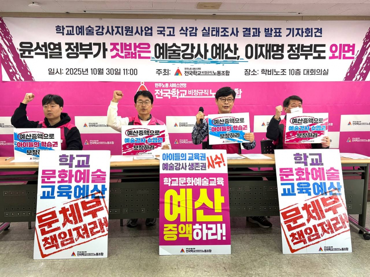 전국학교비정규직노동조합은 오늘(30일) 11시 학비노조 10층 대회의실에서 “윤석열 정부가 짓밟은 예술강사 예산, 이재명 정부도 외면” 학교예술강사지원사업 국고 삭감 실태조사 결과 발표 기자회견을 진행했다.