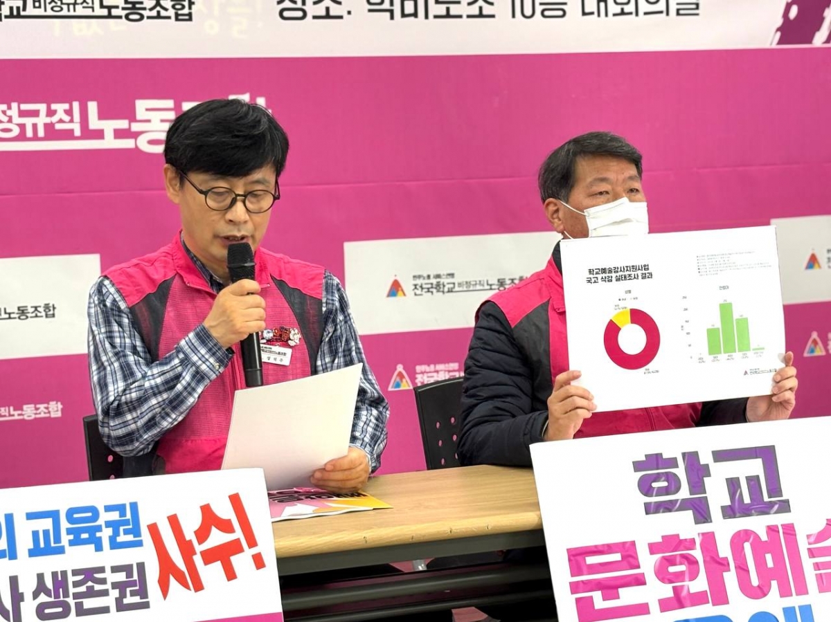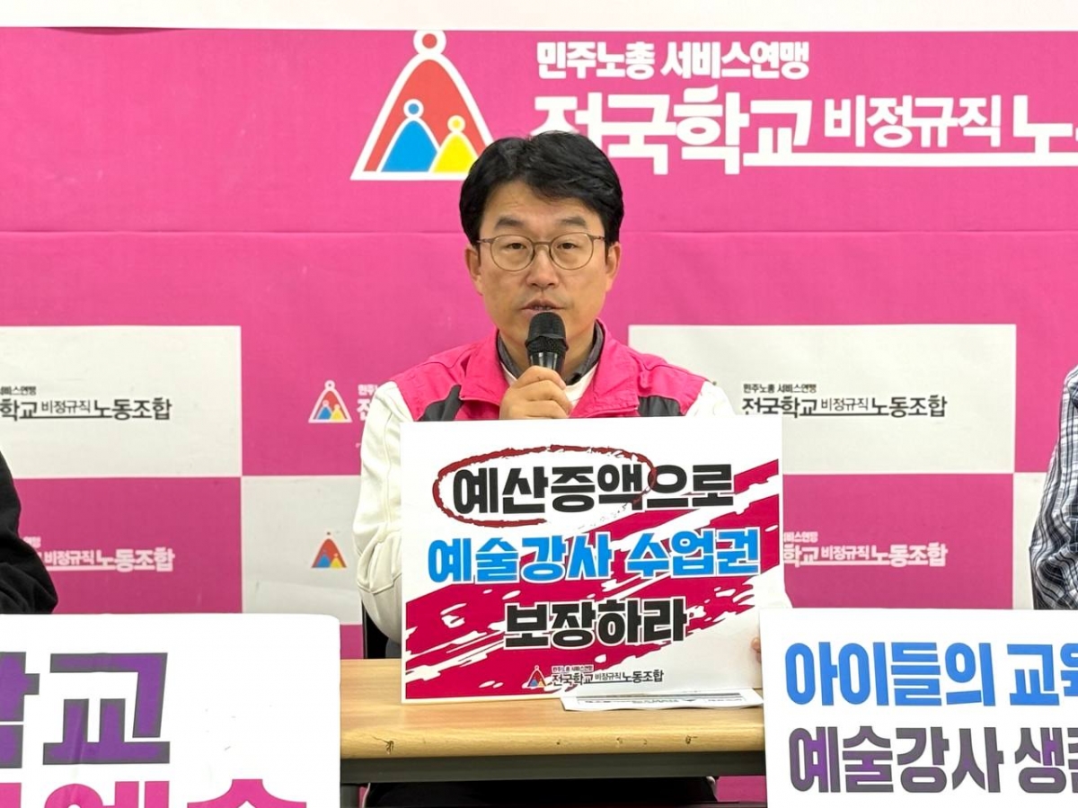 전국예술강사분과는 국가의 외면으로 인해 어려움을 겪고 있는 예술교육의 현실을 알리고, 지속적인 예산 삭감과 불안한 고용 구조로 인해 심화된 예술강사의 수업권과 생존권 침해 문제를 구체적으로 파악하기 위해 실태조사를 진행했다. 전국학교비정규직노동조합 민태호 위원장은 “이재명 대통령은 약속하면 지킨다는 본인의 소신을 스스로 뒤집은 것에 대해 학교문화예술강사들에게 진심으로 사과해야 한다”며 “국회를 통해 정부가 약속한 국비지원에 대해 책임을 다할 것”을 강력히 촉구했다. 성석주 예술강사 전국분과장은 예산 삭감으로 생계를 위한 노동을 병행하는 강사들의 현실을 이야기하며 “아이들은 예술을 잃고, 강사들은 자존을 잃었다”며, “생존을 걱정하는 예술강사들의 현실은 예술이 아닌 생존의 싸움”이라며 절박함을 호소했다.