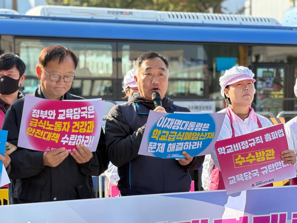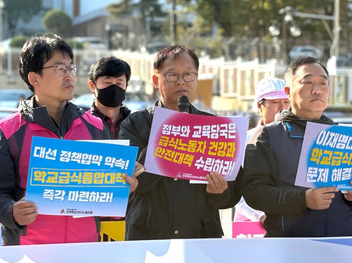 ▶ 대선 정책협약 약속! 학교급식종합대책 즉각 마련하라! ▶ 이재명 대통령은 학교급식노동자의 목소리를 들어라! ▶ 정부와 교육당국은 급식노동자 건강과 안전대책 수립하라! ▶ 학교비정규직 총파업 수수방관 교육당국 규탄한다!