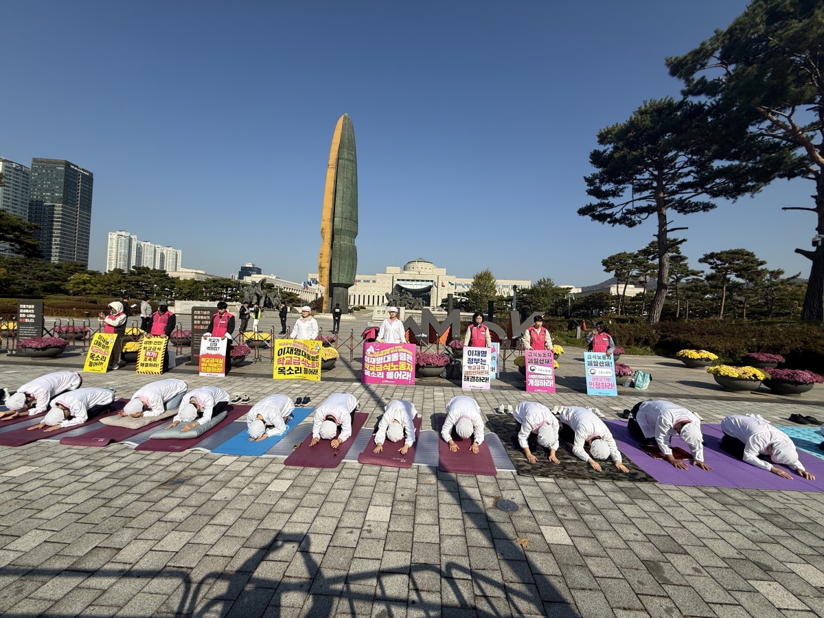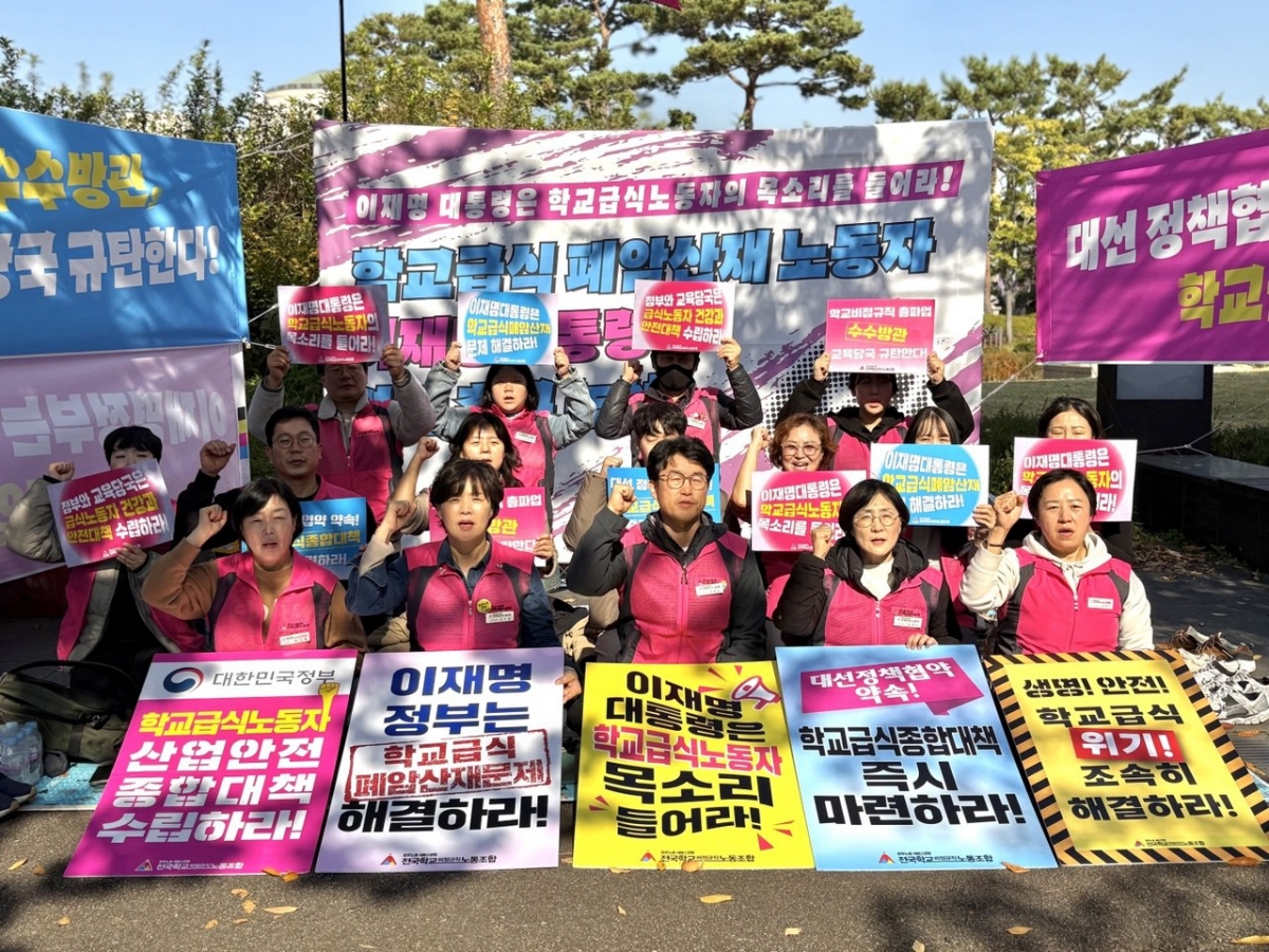 학비노조는 지난 4일(화) 대통령실 앞에서 “학교급식 폐암 산재 노동자-이재명 대통령 면담 촉구” 기자회견을 열고 곧 이어 농성에 돌입했다.