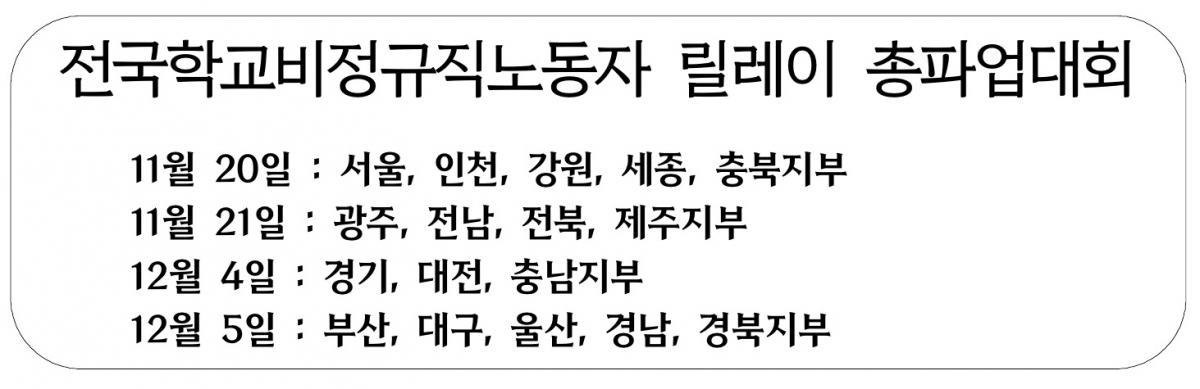 11월 20일부터 시작되는 ‘릴레이총파업대회’를 통해 교육청과 국회, 대통령에게 우리의 정당한 요구를 쟁취하자! 투쟁!