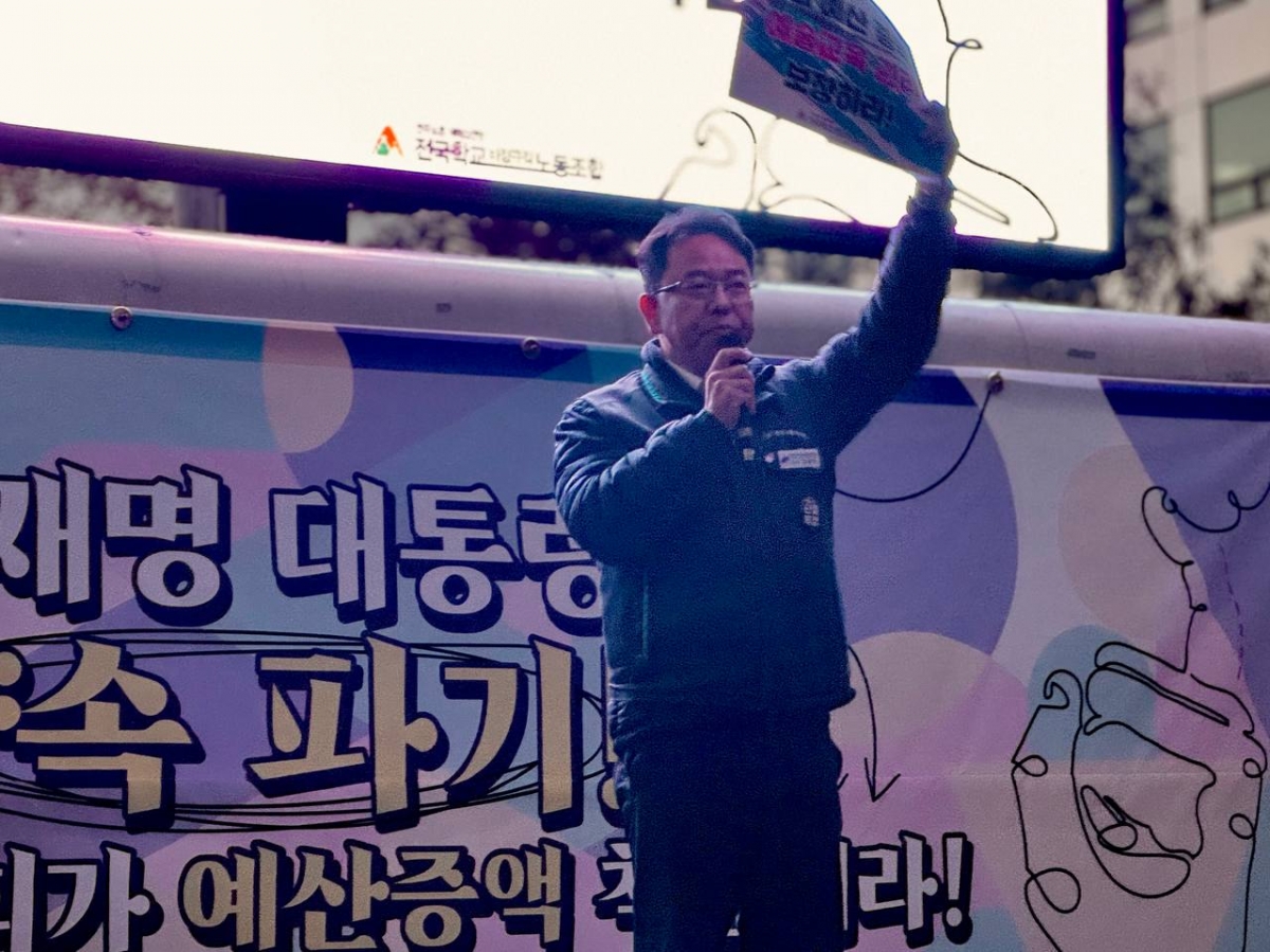 서비스연맹 김광창 위원장은창의적 인재를 키우는 데 학교문화예술교육만큼 필요한 것이 어디에 있냐“AI에 대한 정부지출은 미래에 대한 투자라고 하면서 왜 학교문화예술교육은 죽이려 드냐고 정부의 예산 증액 파기를 강력히 규탄했다.