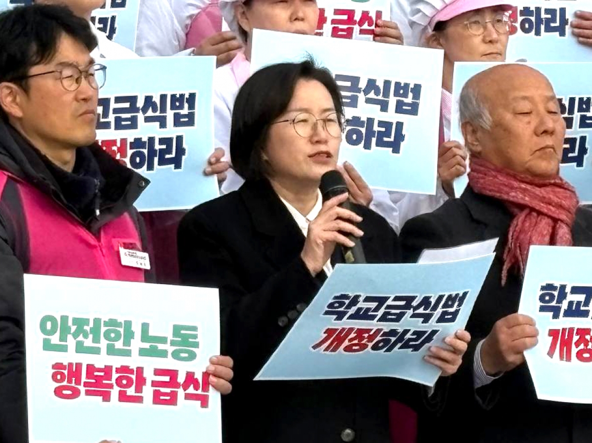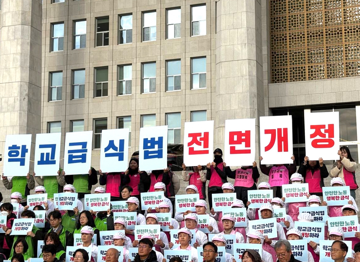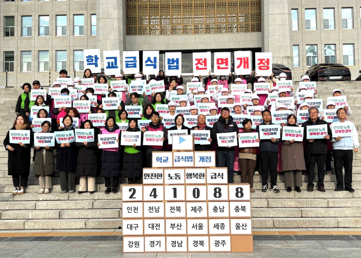 전국학교비정규직노동조합은 지난 27일 9시 30분 국회 본청 계단에서 “학교급식법 전면개정 촉구 기자회견”을 진행했다. 지난 10월부터 전국 17개 시도에서 진행된 <안전한 노동 행복한 급식 100만 청원운동>은 청원 서명인 241,088명을 돌파하며 국민들의 뜨거운 관심을 받았다. 이에 청원운동본부는 청원운동 진행 경과를 알리고, 학교급식법 개정안을 신속히 본회의 통과할 것을 요구하는 기자회견을 개최했다. 민주노총 양경수 위원장은 “과중한 식수 인원은 노동자들이 다치고 죽어갈 수밖에 없는 근본 원인을 단적으로 보여 주고 있다”며, 학교급식법 개정안 통과로 “죽음의 급식실이 아니라 아이들의 희망을 키우는 급식실로 거듭날 수 있도록 노력하겠다”며 결의를 다졌다. 진보당 정혜경 국회의원은 “생명과 안전을 지키기 위한 비용을 논하기 전에 우리는 178명의 폐암산재와 15명의 폐암산재 사망의 대가조차 단 한 번도 치룬 적 없음을 잊어서는 안 된다”며 “생명과 안전이라는 가치를 아이들 밥상에 어떻게 담아낼 것인지 오늘 교육위 법안소위에서 책임 있게 다루어 달라”고 촉구했다. 기자회견 이후, 중식 선전전과 함께 이어진 국회 김영호 교육위원장 면담에서 운동본부는 정권이 바뀐 지금, 교육위원회에서 때를 놓치지 말고 학교급식법 개정안을 반드시 통과시킬 것을 촉구하며 청원운동서명지를 전달했다.