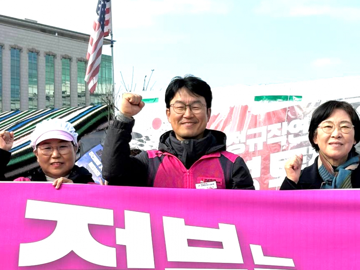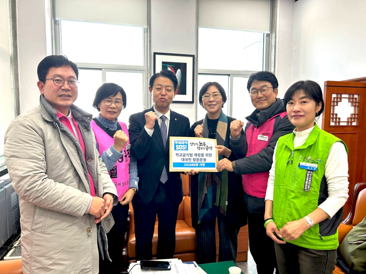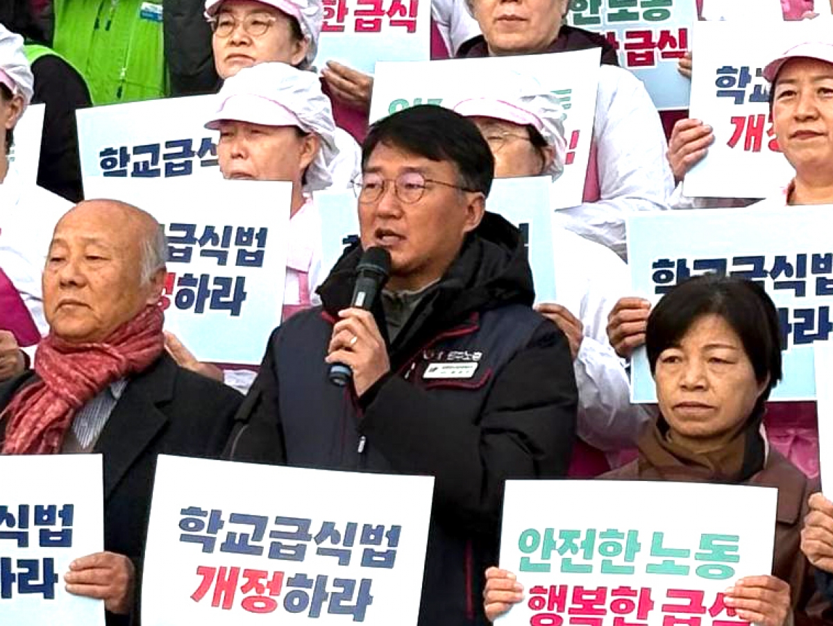 전국학교비정규직노동조합은 지난 27일 9시 30분 국회 본청 계단에서 “학교급식법 전면개정 촉구 기자회견”을 진행했다. 지난 10월부터 전국 17개 시도에서 진행된 <안전한 노동 행복한 급식 100만 청원운동>은 청원 서명인 241,088명을 돌파하며 국민들의 뜨거운 관심을 받았다. 이에 청원운동본부는 청원운동 진행 경과를 알리고, 학교급식법 개정안을 신속히 본회의 통과할 것을 요구하는 기자회견을 개최했다. 민주노총 양경수 위원장은 “과중한 식수 인원은 노동자들이 다치고 죽어갈 수밖에 없는 근본 원인을 단적으로 보여 주고 있다”며, 학교급식법 개정안 통과로 “죽음의 급식실이 아니라 아이들의 희망을 키우는 급식실로 거듭날 수 있도록 노력하겠다”며 결의를 다졌다. 진보당 정혜경 국회의원은 “생명과 안전을 지키기 위한 비용을 논하기 전에 우리는 178명의 폐암산재와 15명의 폐암산재 사망의 대가조차 단 한 번도 치룬 적 없음을 잊어서는 안 된다”며 “생명과 안전이라는 가치를 아이들 밥상에 어떻게 담아낼 것인지 오늘 교육위 법안소위에서 책임 있게 다루어 달라”고 촉구했다. 기자회견 이후, 중식 선전전과 함께 이어진 국회 김영호 교육위원장 면담에서 운동본부는 정권이 바뀐 지금, 교육위원회에서 때를 놓치지 말고 학교급식법 개정안을 반드시 통과시킬 것을 촉구하며 청원운동서명지를 전달했다.