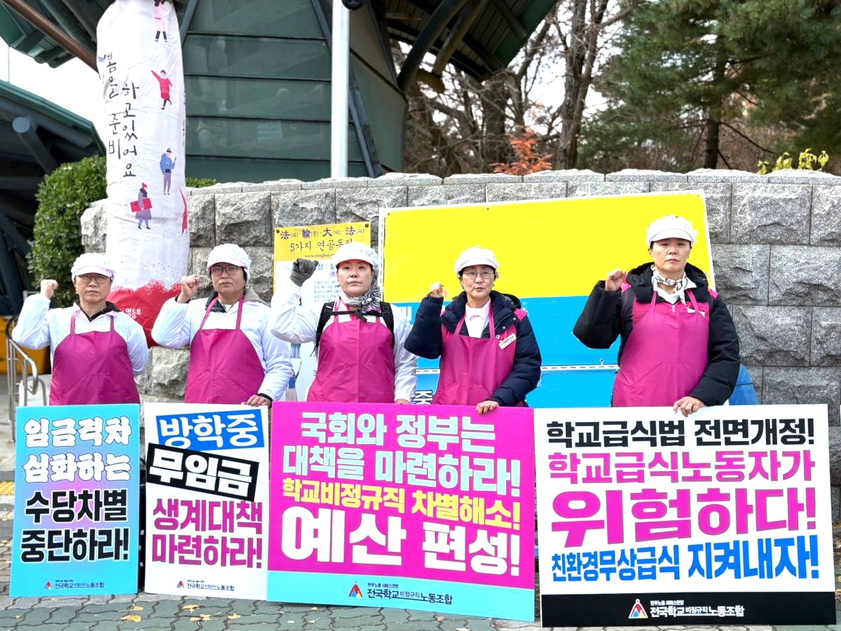 ▶ 교육당국과 정부는 급식실 위탁 운영 시도를 중단하고, 친환경 무상급식에 대한 중앙정부의 재정 책임을 강화하라! ▶ 정부는 급식노동자 폐암 산재에 대한 범정부 차원의 종합대책을 즉각 마련하라!