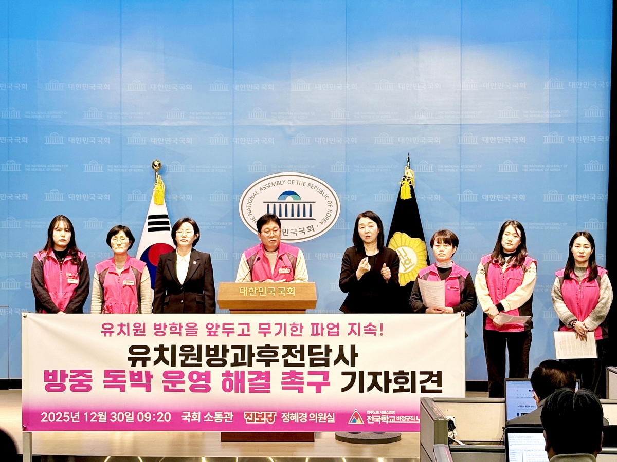 전국학교비정규직노동조합은 오늘(30) 국회 소통관에서 유치원방과후전담사 방중 독박 운영 해결 촉구 국회 기자회견을 진행했다.