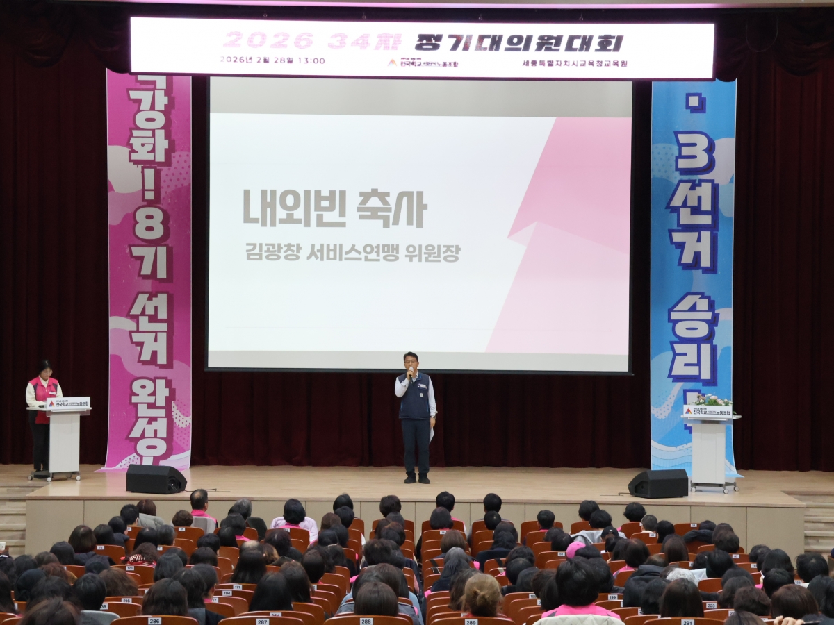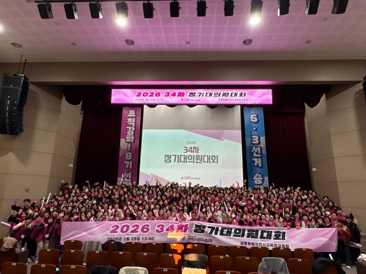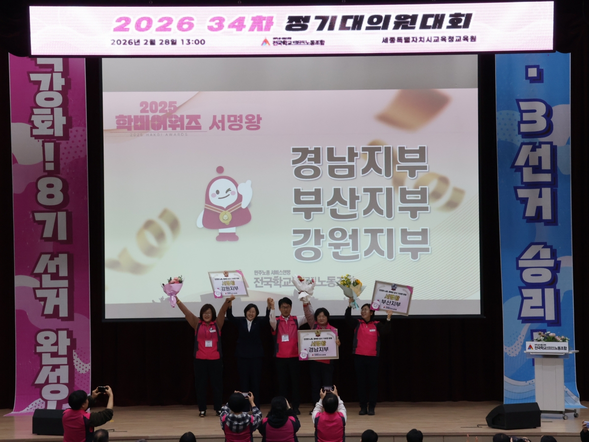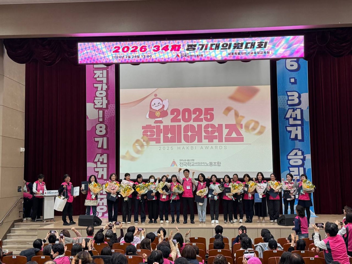 전국학교비정규직노동조합(학교비정규직노조)은 지난 2월 28일 세종 교육청 교육원 대강당에서 34차 정기대의원대회를 열고 2025년 사업평가와 2026년 사업계획 등을 논의하고 결정하였다. 이번 대의원대회에는 양경수 민주노총 위원장, 김광창 서비스연맹 위원장, 정혜경 진보당 국회의원 등이 함께 자리해 주었다. 김재연 진보당 상임대표는 영상으로 인사말을 전했다.