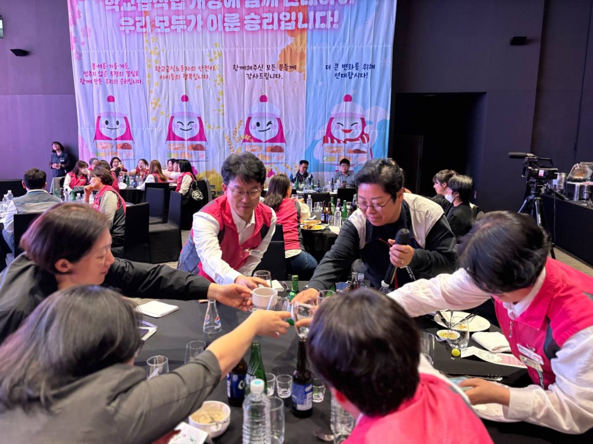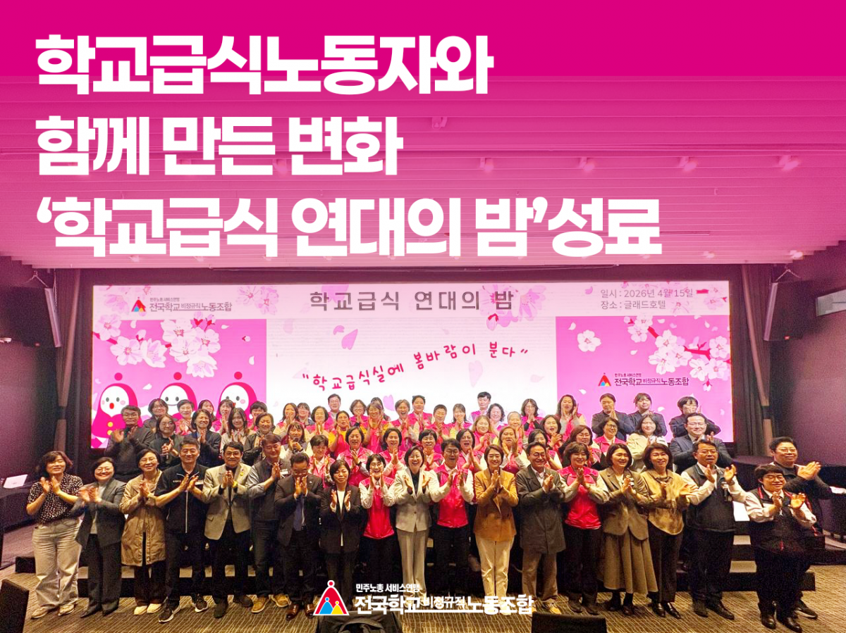 전국학교비정규직노동조합(위원장 민태호, 이하 학교비정규직노조)은 지난 2026년 4월 15일 저녁, 여의도 글래드호텔에서 ‘학교급식 연대의 밤 - 학교급식실에 봄바람이 분다’를 열고 학교급식 관련 법 개정 과정에서 함께 힘을 모은 정치권·노동계·시민사회·학생·학부모 단체 관계자들에게 감사의 뜻을 전했습니다.