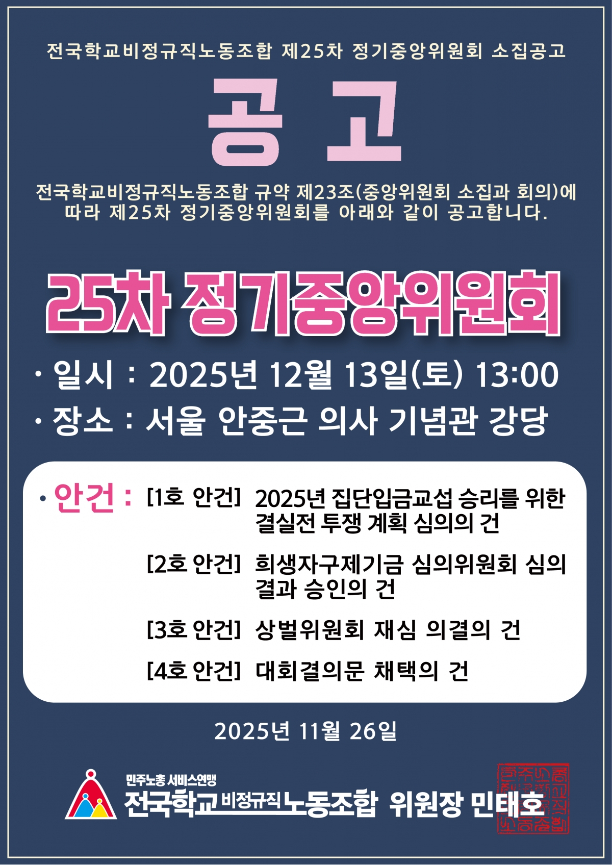 전국학교비정규직노동조합 25차 정기중앙위원회 소집공고